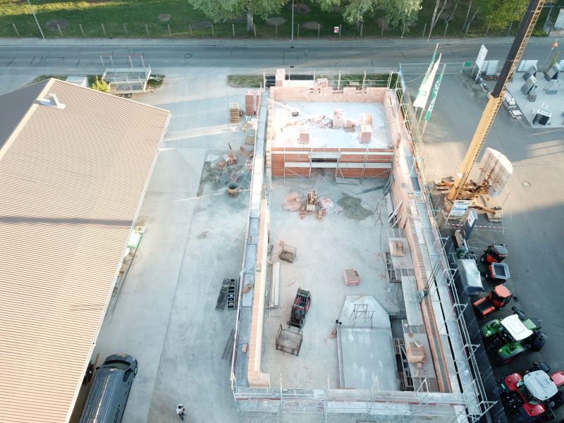 Auf dem Gelände unsere bestehenden Werkstatt im Gewerbegebiet Oettingen entsteht aktuell eine neue Halle mit Werkstatt, Lager- und Büroräumen. Beheizt wird der Neubau mit einer Hackschnitzelheizung. Auch die Bestandsgebäude sowie die BayWa auf dem Nachbargrundstück werden an diese angeschlossen.